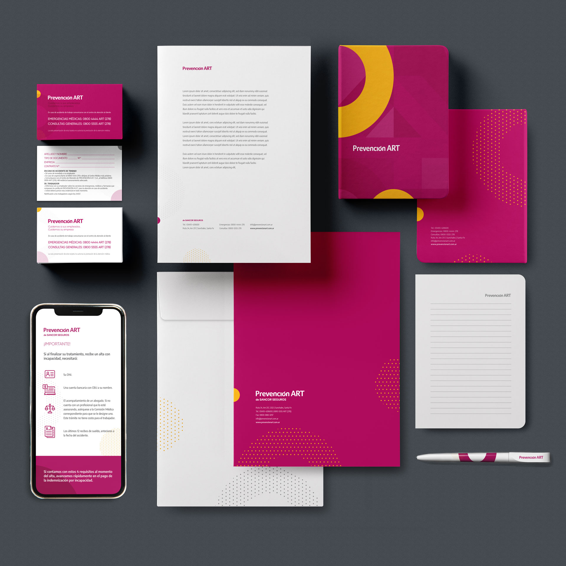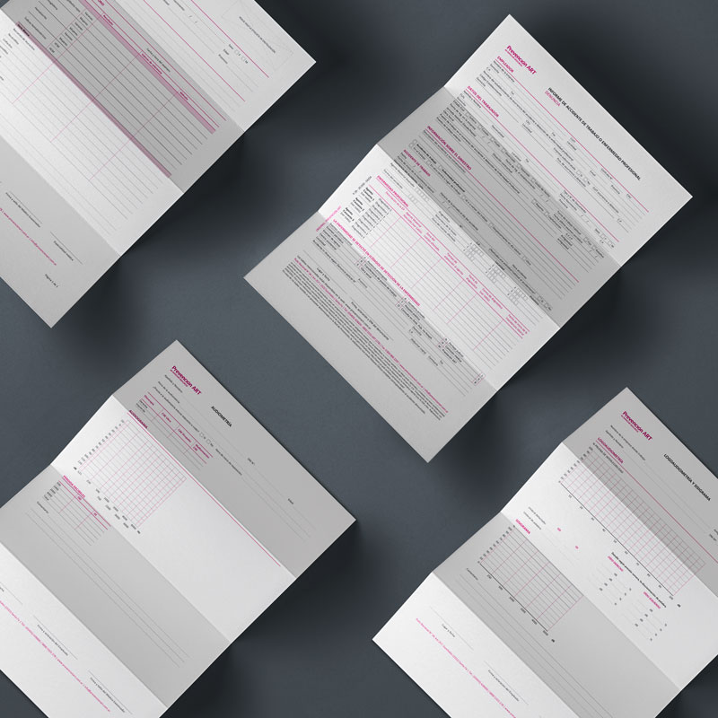 Apertura de piezas de identidad a partir de logo existente, para empresa de seguro de riesgos de trabajo. Se diseñaron formularios, papelería, credenciales, mailings, flyers e instructivos, sistemas de íconos para aplicaciones y web.